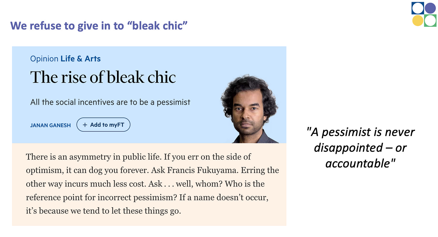 In my book, I often reference another report, the 2023 Global Solidarity Report, highlighting that while our world teeters on the edge, public sentiment often outpaces leadership on critical issues. It's easy to succumb to doomsday thinking or seek validation through pessimism and shaming. As a recent addition to the advisory board of the Global Solidarity Report, I was presented with this compelling slide: